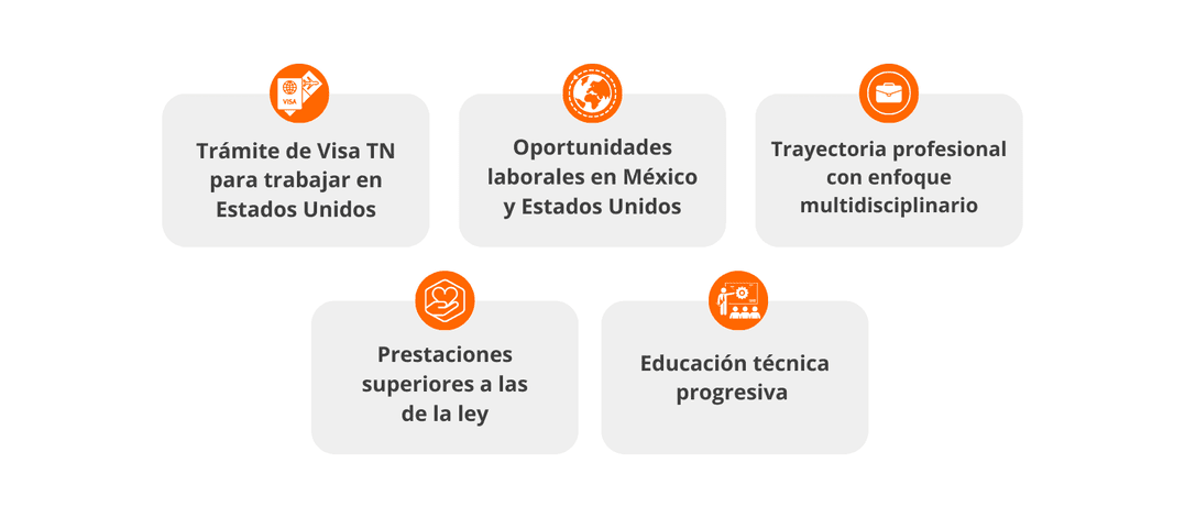Además, contamos con oportunidades profesionales tanto en México como en Estados Unidos, ampliando el alcance de nuestro talento y soluciones